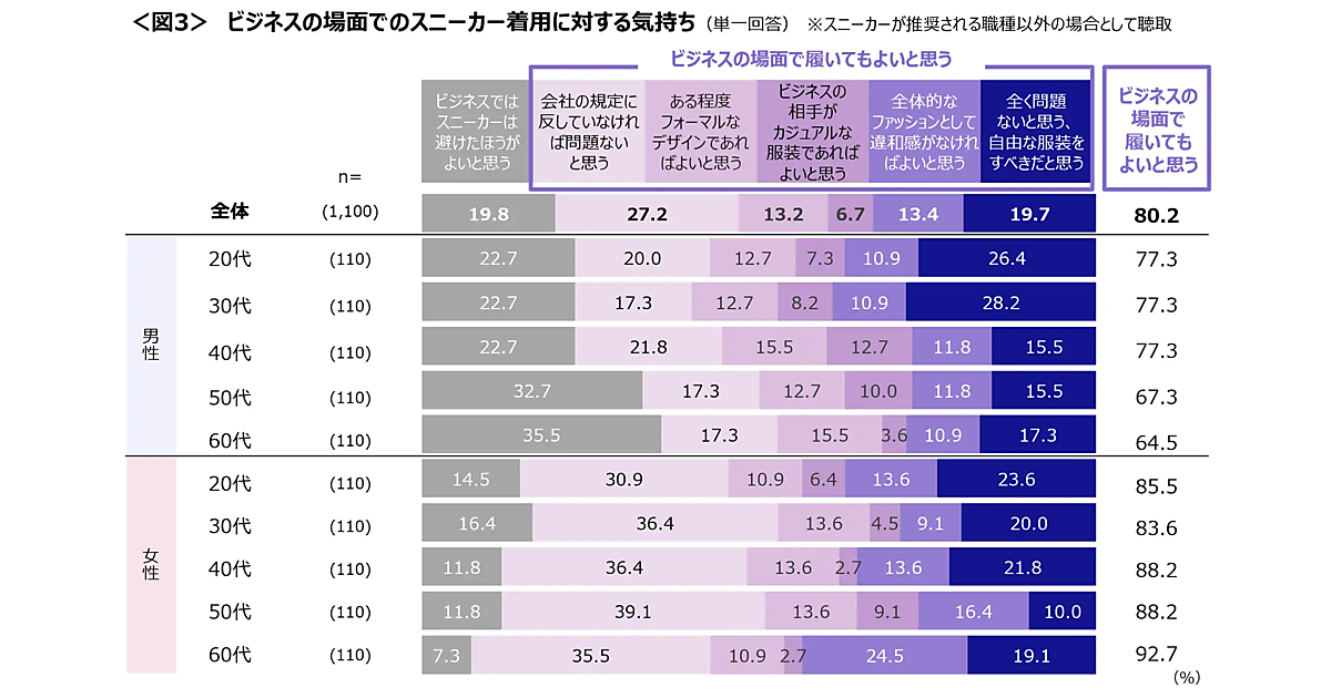 ビジネスシーンでのスニーカー着用に対する意識を聞くと、全体では約8割が「ビジネスの場面で履いてもいいと思う」という結果に。性年代別に見ると、男性の50~60代において「ビジネスではスニーカーは避けたほうがよいと思う」が3割以上となり、否定的な傾向が見られた。その一方で、男性20~30代は「全く問題ないと思う、自由な服装をすべきだと思う」が比較的多く、女性は年代が上がるほど寛容な傾向だった。