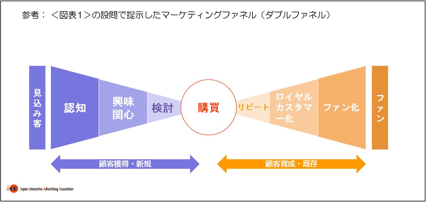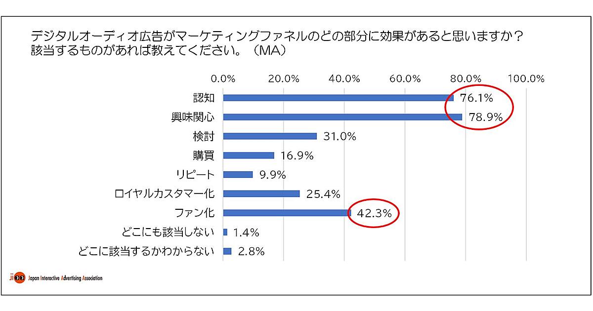 この調査では、マーケティングファネル(ダブルファネル)の図表を提示し、「デジタルオーディオ広告の効果が想定できる部分」を質問した。その結果、「興味関心」78.9%、「認知」76.1%が上位だった。また、既存顧客に対する効果として「ファン化」42.3%も高い。