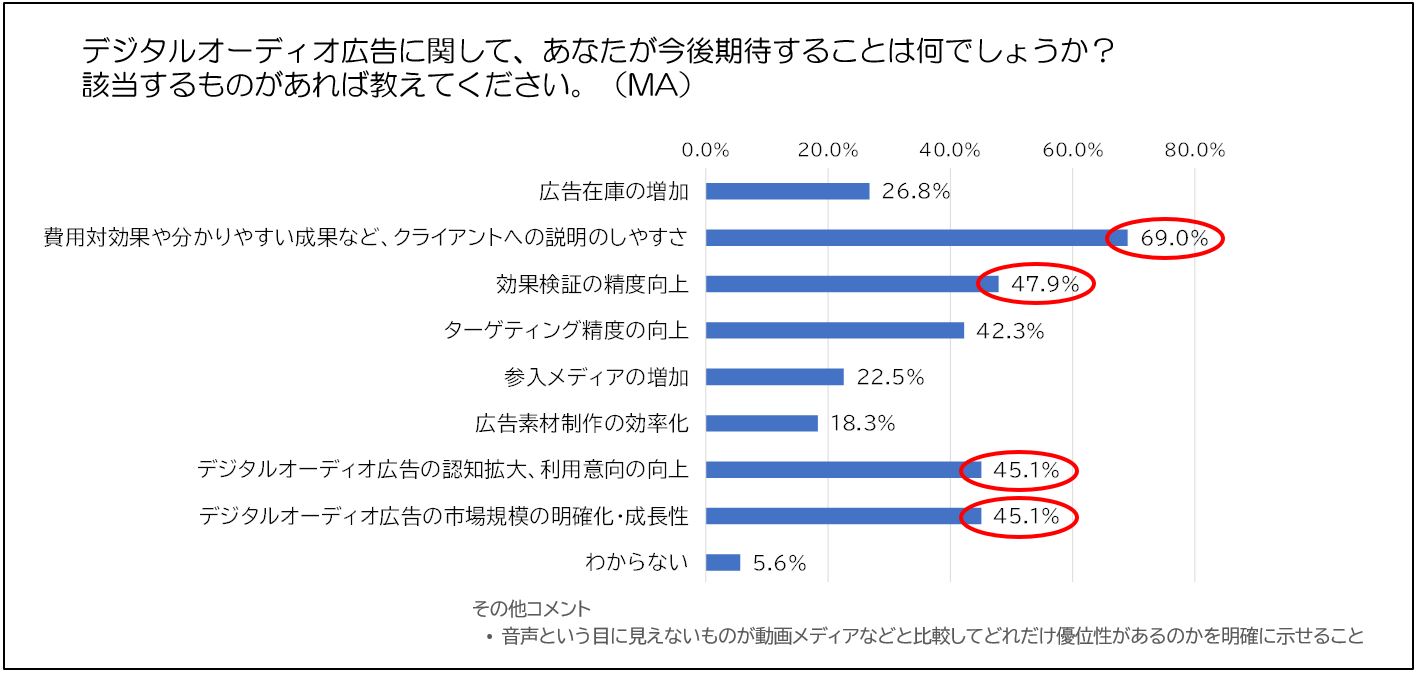 また「デジタルオーディオ広告に対して今後期待すること」を聞くと、「費用対効果や分かりやすい成果などクライアントへの説明のしやすさ」69.0%が特に多く、「効果検証の精度向上」47.9%、「認知拡大、利用意向の向上」45.1%、「市場規模の明確化、成長性」45.1%などの声が続いた。