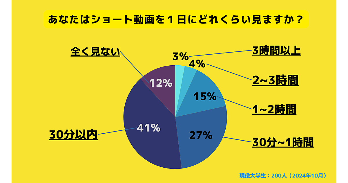 まず「ショート動画を1日にどれくらい見ますか」と聞くと、「まったく見ない」は12%で、残る約9割の大学生が毎日ショート動画を視聴していた。最も多いのは「30分以内」41%で、「30分~1時間」27%、「1~2時間」15%がそれに続いており、大学生の多くが一定時間ショート動画を毎日視聴している。