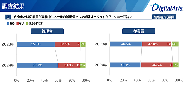 誤送信経験者は管理者が59.9%、従業員で45.0%