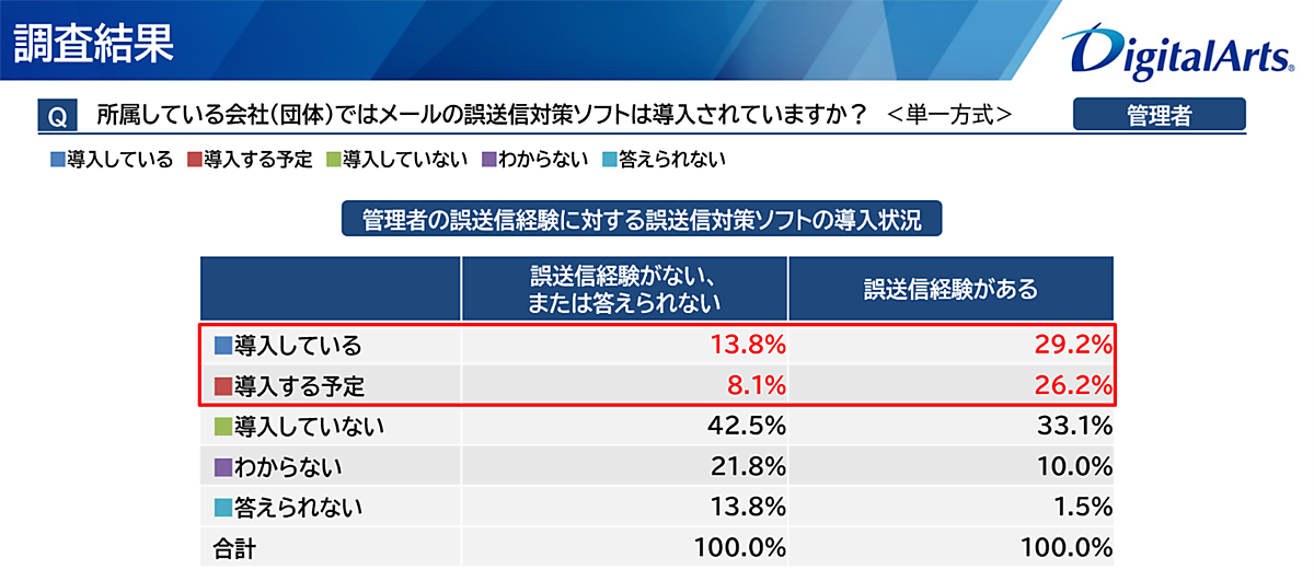一方で「誤送信対策ソフトの導入状況」を聞くと、「導入済み+導入検討中」が41.9%。誤送信の経験の有無で見ると、導入済みまたは導入検討中とした管理者は55.4%だが、誤送信の経験がないまたは答えられない管理者では21.9%にとどまった。