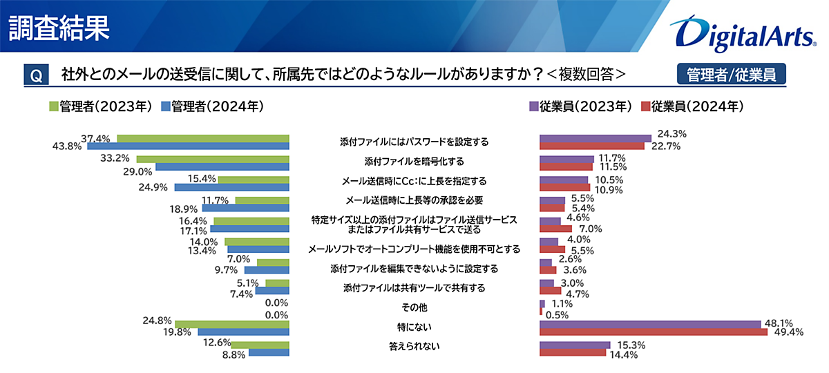 「社外とのメール送受信に関するルール」について聞くと、「添付ファイルにはパスワードを設定する」が管理者で約4割、従業員で約2割と最多。以下「添付ファイルを暗号化する」「メール送信時にCC:に上長を指定する」「メール送信時に上長等の承認を必要」などが上位だった。一方で、従業員の49.4%は「特にない」と回答しており、社内ルールが不十分な状況が推察される。