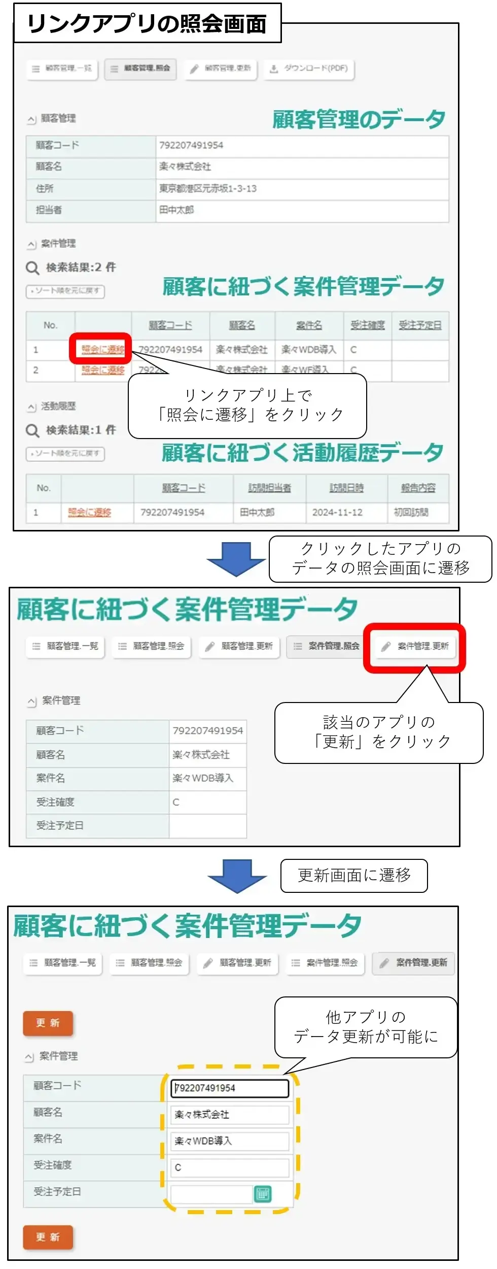 リンクアプリは、顧客管理と案件管理、活動履歴をひも付けて案件状況を確認したり、商品マスタ(基本情報)と売上台帳のひも付けで商品ごとの仕様と取引状況が参照できたりする。複数アプリのデータ更新には各アプリを開き直す必要があったが、今回リンクアプリ画面で可能な機能を加え、データ管理がリンクアプリで完結するようにした。