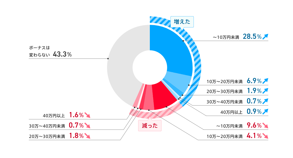 前回(2022年9月~2023年8月)のボーナスに比べ、支給額がどのように変わったかを聞くと、「増えた」が38.9%、「減った」が17.8%という結果に。「増えた」は前回調査から4.9ポイントアップしており、賃上げが一定の影響を与えていることがうかがえた。