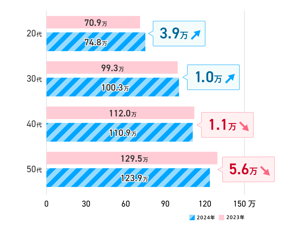 年代別でみると、20代は3.9万円、30代は1.0万円増加していた。一方で、40代は1.1万円、50代は5.6万円の減少となっており、世代による差が見られた。なお、30代の年間平均ボーナスは99.3万円→100.3万円に上昇した。