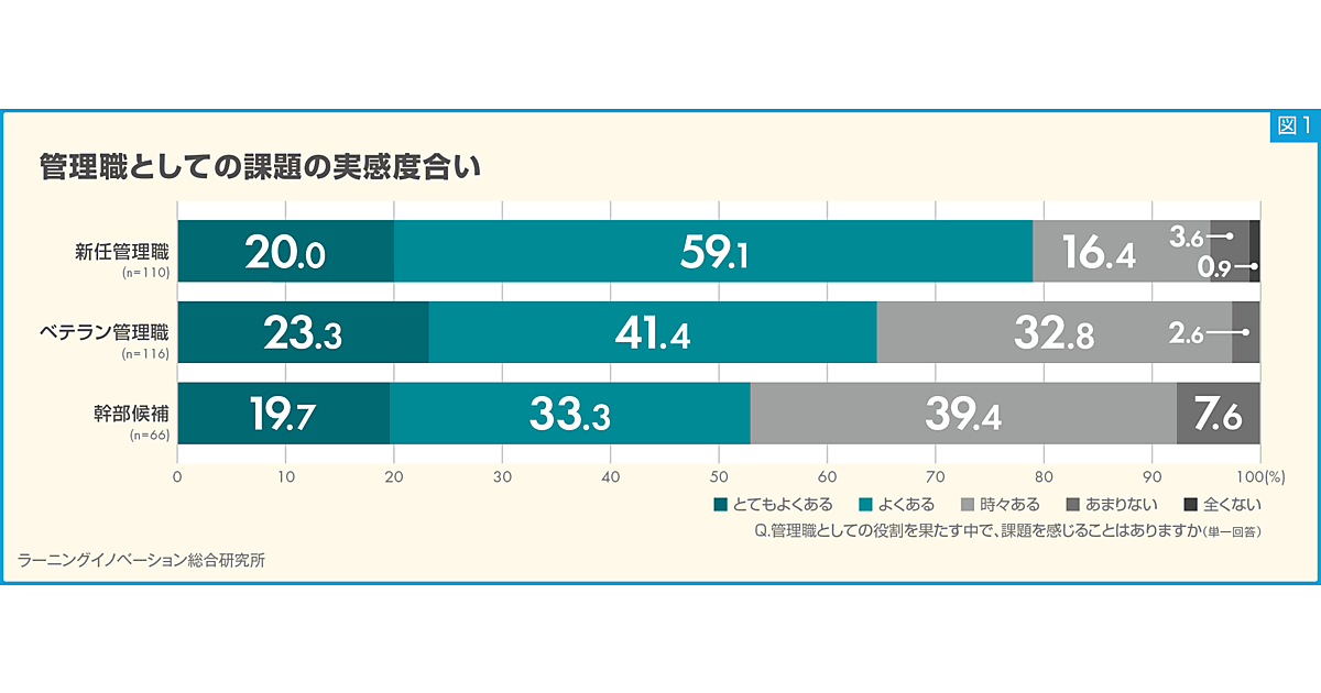 まず「管理職としての役割を果たす中で、課題を感じることがどれほどあるか」を聞くと、「とてもよくある+よくある」の割合は、新任管理職79.1%、ベテラン管理職64.7%、幹部候補53.0%だった。