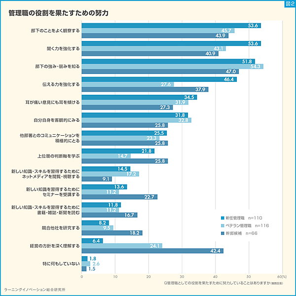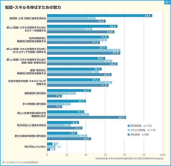 また「自身の知識・スキルを伸ばすために努力していること」を聞くと、新任管理職は「経営陣・上司・同僚に助言を求める」54.5%が圧倒的多数。ベテラン管理職は「新しい知識・スキルを習得するためにネットメディアを閲覧・視聴する」37.9%が比較的高い。そして幹部候補は「新しい仕事の取り組み方を積極的に試す」40.9%が最多だった。