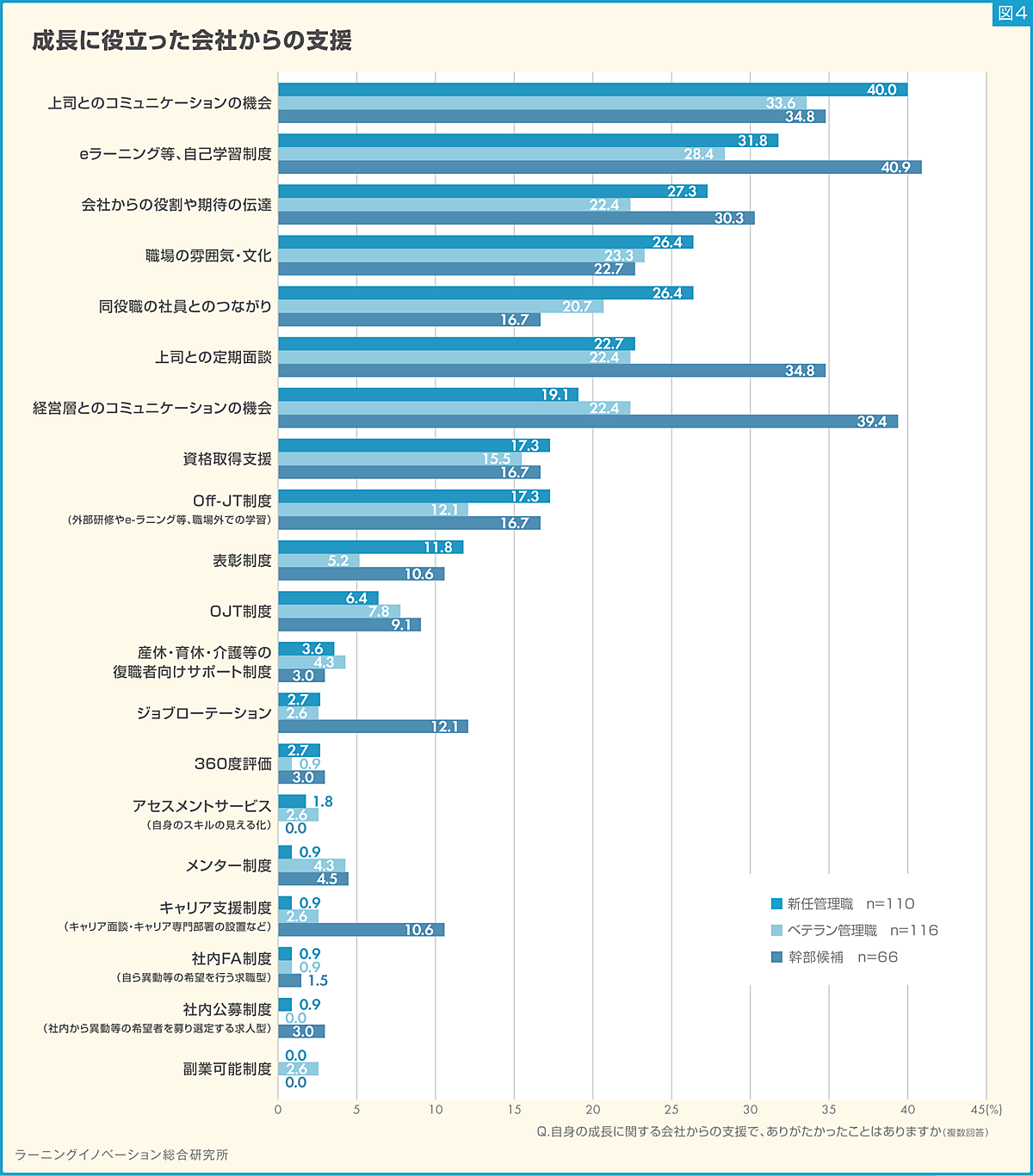 最後に「成長の役に立った会社からの支援」について聞くと、新任管理職は「上司とのコミュニケーションの機会」40.0%、「eラーニング等、自己学習制度」31.8%、「会社からの役割や期待の伝達」27.3%が上位。ベテラン管理職は「上司とのコミュニケーションの機会」33.6%、「eラーニング等、自己学習制度」28.4%、「職場の雰囲気・文化」23.3%が上位。幹部候補は「eラーニング等、自己学習制度」40.9%、「経営層とのコミュニケーションの機会」39.4%、「上司とのコミュニケーションの機会」「上司との定期面談」同率34.8%が上位だった。