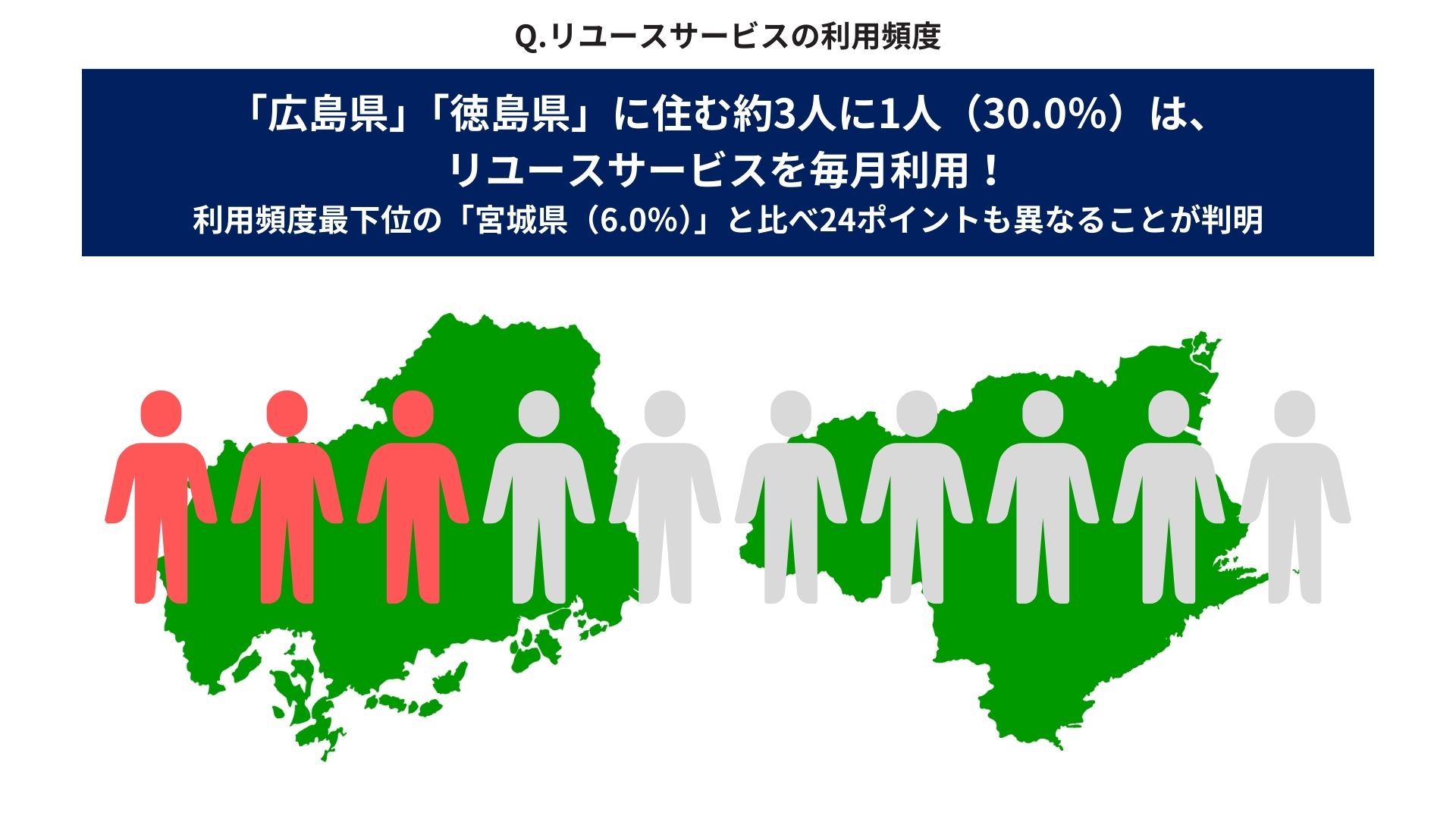 次に「リユースサービスの利用頻度(月に1回以上)」を聞くと、「広島県」「徳島県」30.0%が同率1位。「広島県」「徳島県」は、サステナビリティに対する意識でもトップ10にランクインしている。一方、月1回以上のリユース利用者がもっとも少ないのは「宮城県」6.0%と、24ポイントもの開きがあった。
