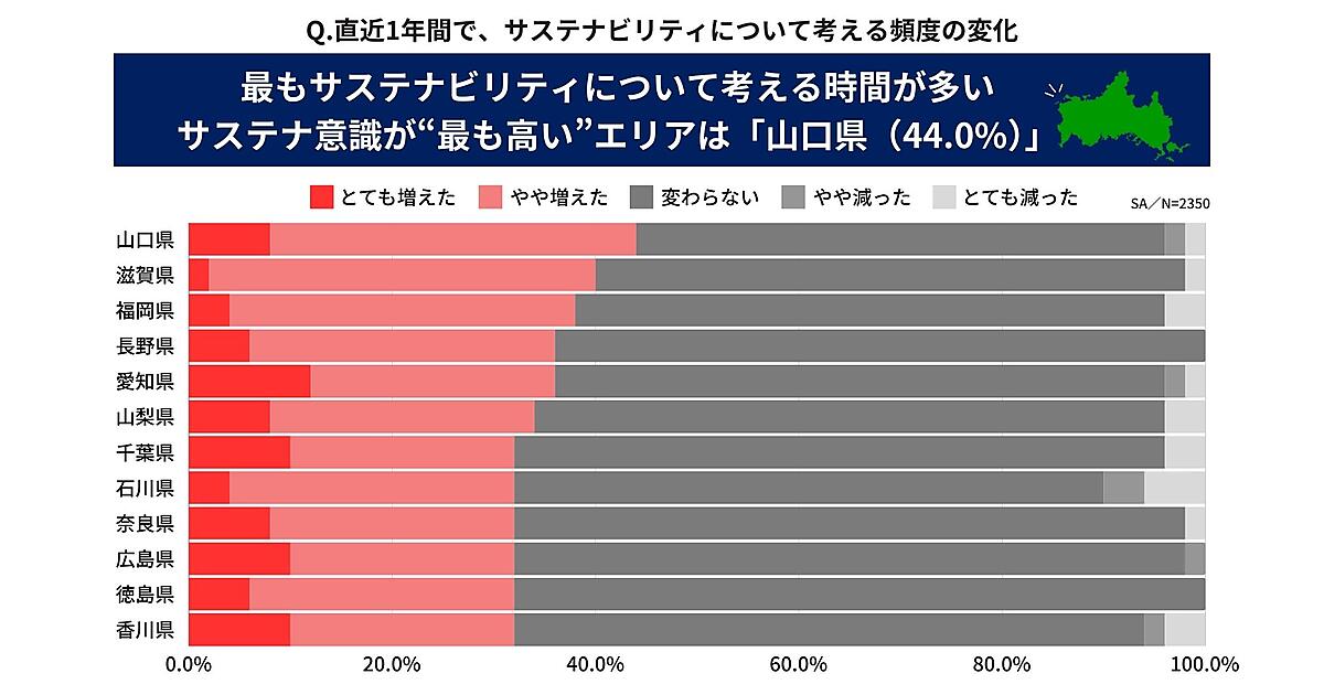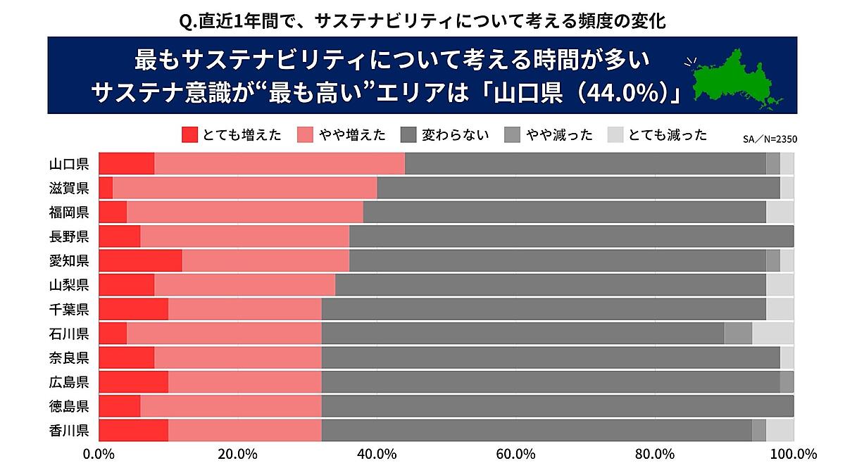 まず「直近1年間でサステナビリティについて考える頻度が増えたか/減ったか」を聞くと、「とても増えた+やや増えた」の合計がもっとも多かったのは「山口県」44.0%で、「滋賀県」40.0%、「福岡県」38.0%がそれに続いた。