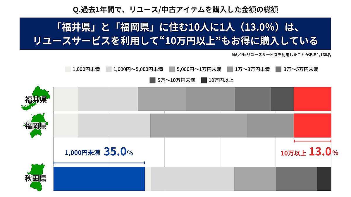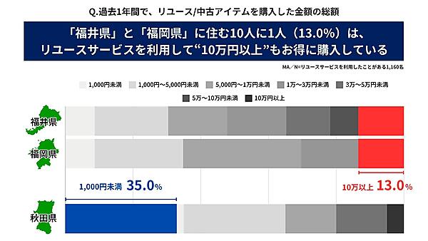 リユース/中古アイテムの購入経験があると回答した1,122人に対して、「過去1年間で購入したリユース商品の総額」を聞くと、「1,000円~5,000円未満」35.0%が最多。都道府県別では「福井県」「福岡県」の13.0%が、過去1年に「10万円以上購入」と回答しており、全体平均の3.7%を大きく上回った。逆に「秋田県」の35.0%は「1,000円未満」と回答しており、他の都道府県と比べて購入金額がもっとも少なかった。