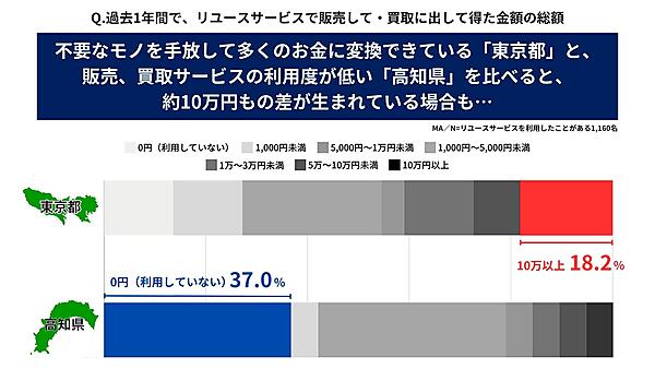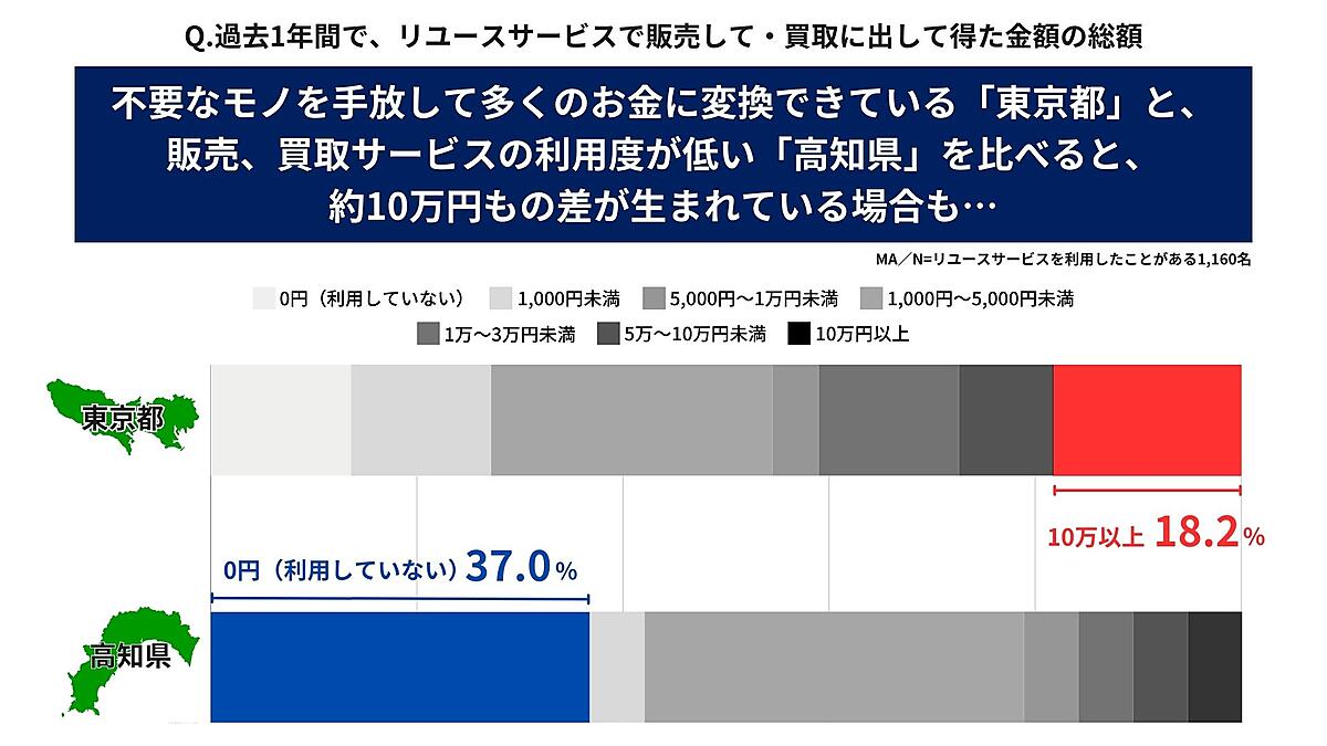 最後に、リユースサービスを年に1回以上利用している1,160人に「過去1年間でリユースサービスを通して得た金額」を聞くと、「1,000円~5,000円未満」27.8%が最多。都道府県別では「東京都」18.2%が“10万円以上”も換金できており、全体の3.8%を4倍以上も上回った。逆に「高知県」は「0円(販売・買取サービスは利用していない)」が36.8%も存在した。