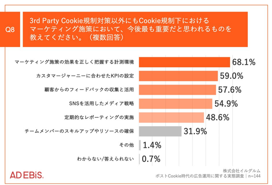 Cookie規制下でのマーケティング施策で最も重要だと思うものとしては、「マーケティング施策の効果を正しく把握する計測環境」が68.1%で1位に。以下「カスタマージャーニーに合わせたKPIの設定」が59.0%、「顧客からのフィードバックの収集と活用」が57.6%と続いた。