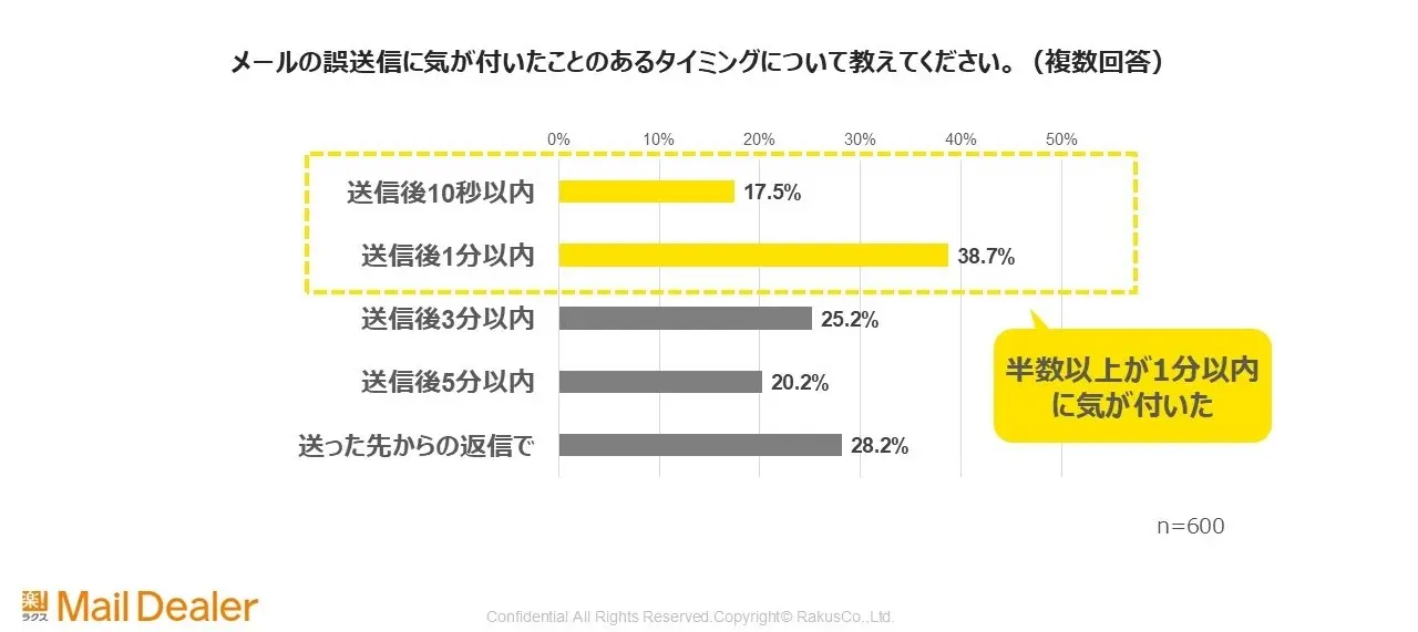 メールの誤送信に気がつくタイミングとしては、「送信後1分以内」が38.7%で最多に。「送信後10秒以内」と合わせると、半数以上がメール送信直後にミスに気づいていることがわかった。