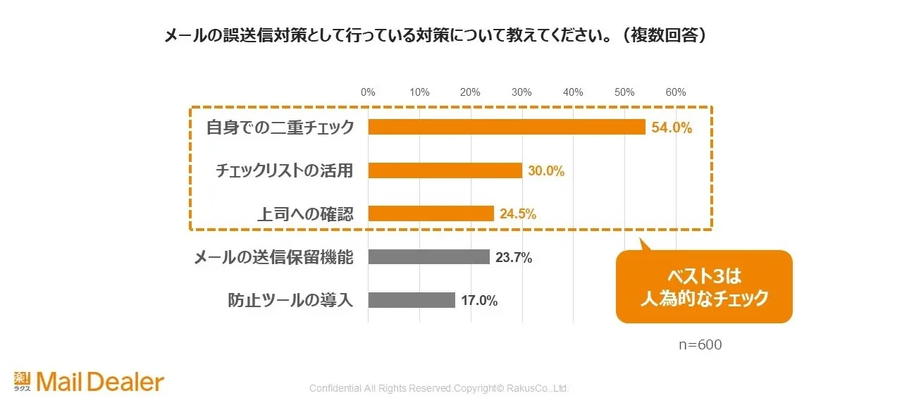 メールの誤送信対策として実施している内容としては、「自身での二重チェック(54.0%)」「チェックリストの活用(30.0%)」「上司への確認(24.5%)」など、人為的なチェックが上位を占める結果となった。
