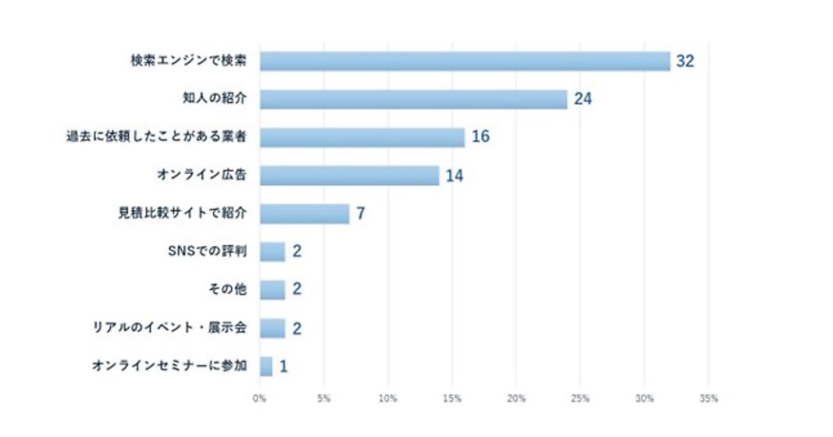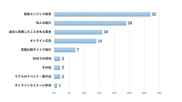 まず「Webサイト制作の外注先をどのように見つけたか?」を聞くと、「検索エンジンで検索」32人が最多で、「知人の紹介」24人、「過去に依頼したことがある業者」16人が続いた。