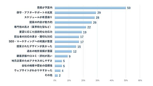 「Webサイト制作の外注先を最終的に決定した理由」では、「見積が予算内」50人が圧倒的に多く、「保守・アフターサポートの充実」29人、「スケジュールが希望通り」28人などを大きく上回っている。サポートやスケジュールより予算が重視されていることがわかる。