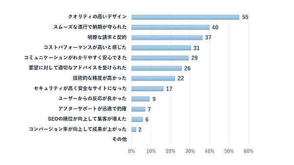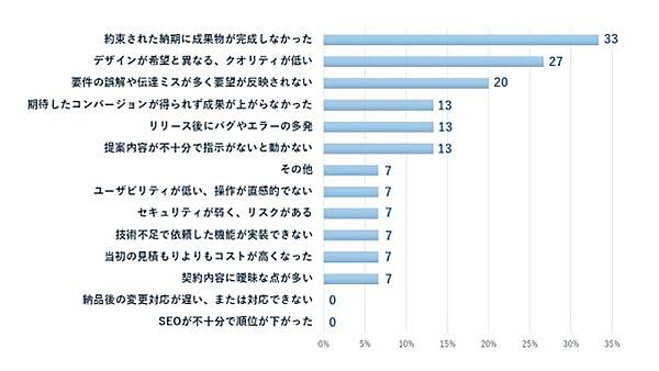 逆に不満を感じた企業からは「約束された納期に成果物が完成しなかった」33人が最多で、「デザインが希望と異なる、クオリティが低い」27人を上回った。デザインの精度もさることながら、まずはスケジュール順守が重要のようだ。