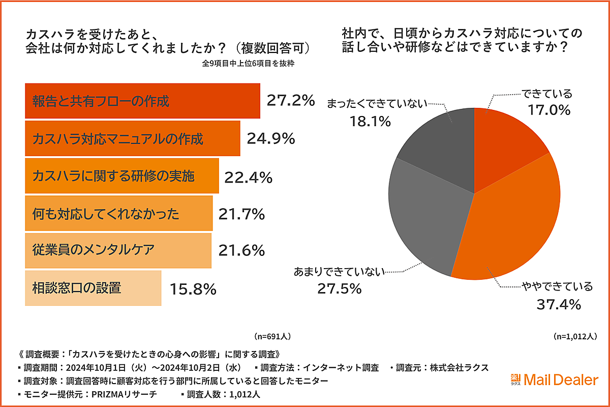 「カスハラを受けたあと、会社は何か対応してくれましたか?」と聞くと、「報告と共有フローの作成」27.2%が最多で、「カスハラ対応マニュアルの作成」24.9%、「カスハラに関する研修の実施」22.4%が上位で、会社側はできるだけ対応している様子がうかがえる。