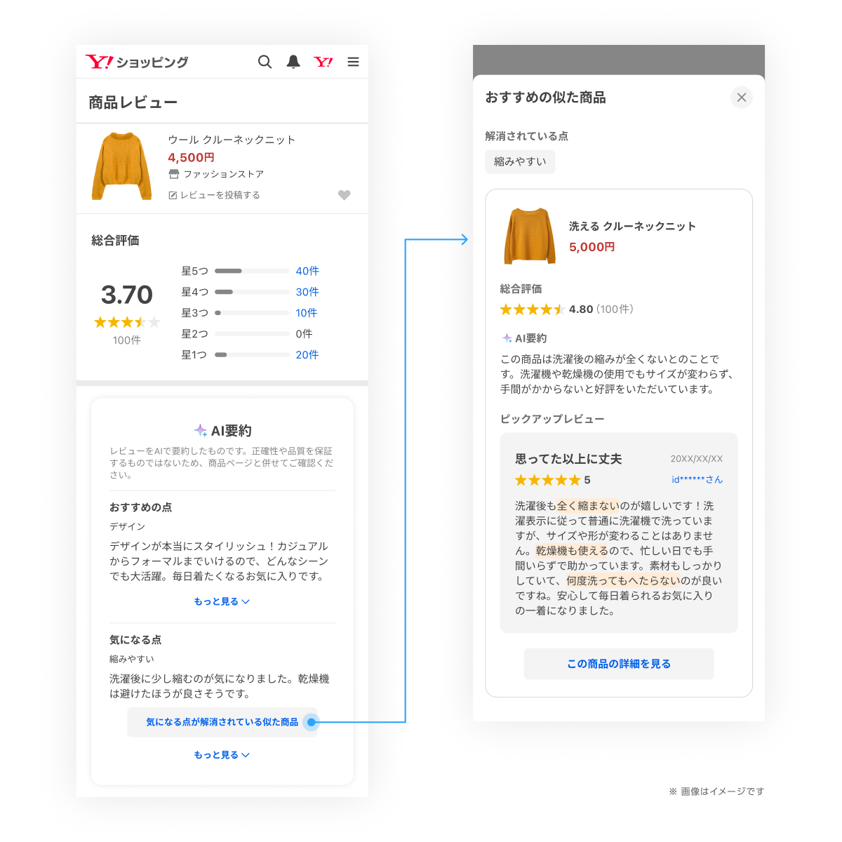 Yahoo!ショッピングで取り扱う商品には、実際に購入したユーザーがレビューを投稿できる機能があるが、レビュー内容の観点ごとで商品を比較・検討できるようになる。例えば服の購入を検討しているとき、気になる商品に「生地が薄かった」という内容で、その商品自体の平均評価より低い評価のレビューがついていた場合、同じ「生地」という観点でより高評価なレビューがついている類似商品を生成AIが提案する。