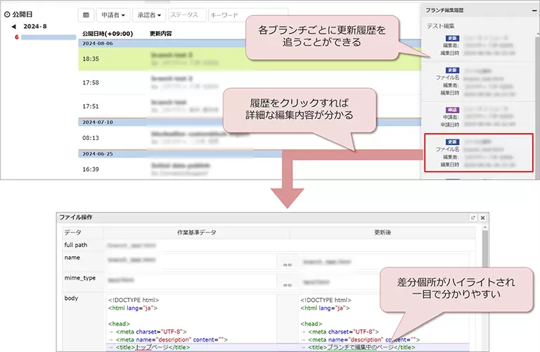 複数の担当者が同時に編集作業を進めることができる。サイトのデザインとコーディングを別々の担当者が進める場合や、複数部門で更新内容の確認・修正が必要な場合もそれぞれの作業を同じ編集領域でできるので、サイト更新がスピーディーになり公開スケジュールの短縮に寄与する。大規模なWebサイトリニューアでは変更履歴の追跡が重要だが、各担当者の変更履歴が明確に管理されてプロジェクトの透明性と信頼性が向上する。