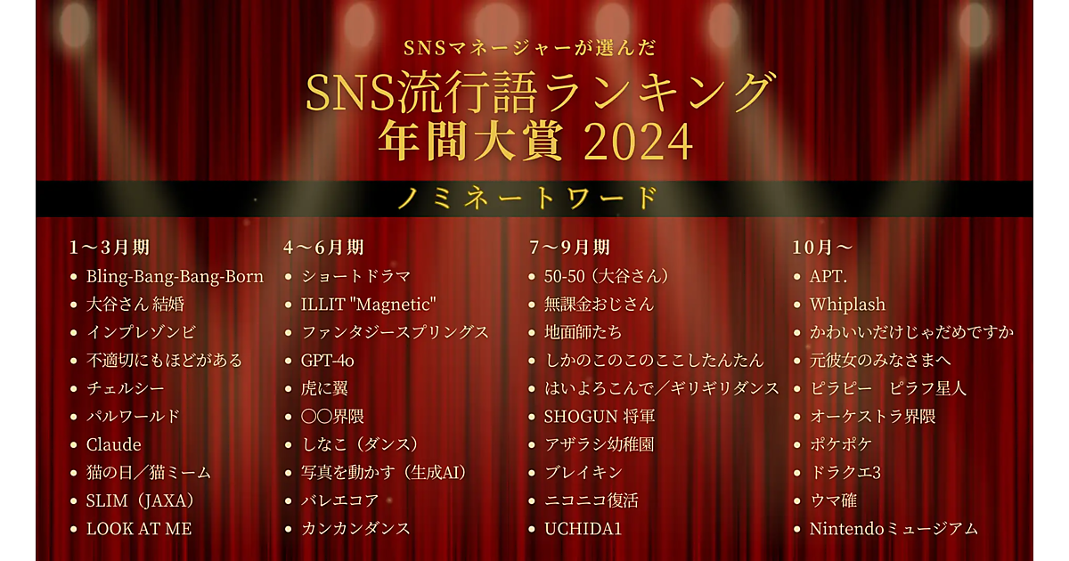 ウェブ解析士協会は、「SNS流行語ランキング年間大賞2024」にノミネートされた40ワードを発表した。同社では2022年3月度から四半期ごとに最新の流行語ランキングを公表しており、年末には「年間大賞」を発表予定である。