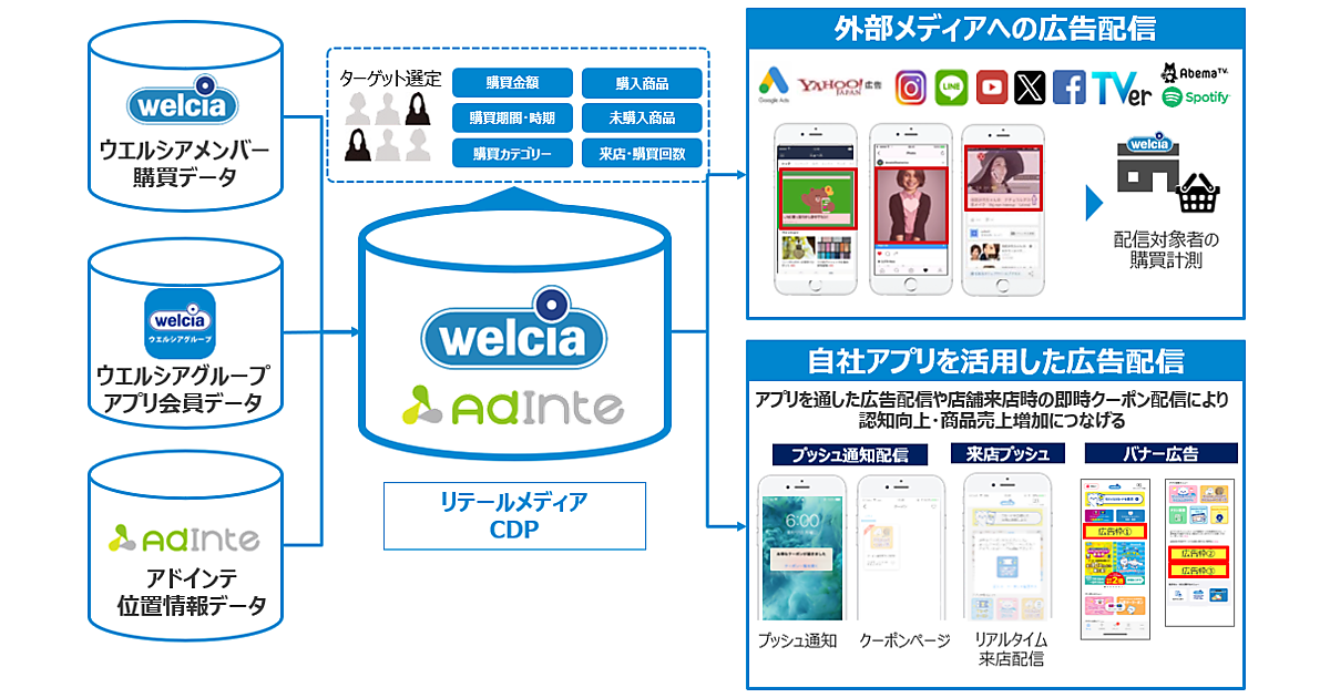 アドインテのリテールメディア開発、運用ノウハウと技術、ウエルシアの全国店舗網と強固な顧客基盤を駆使する。会員データやID-POSデータを分析し、Googleや各SNSなど外部メディアと連携して、購買行動に合わせたデータドリブン(駆動)なデジタル広告ソリューションの提供からリアル店舗での購買検証まで提供可能になる。