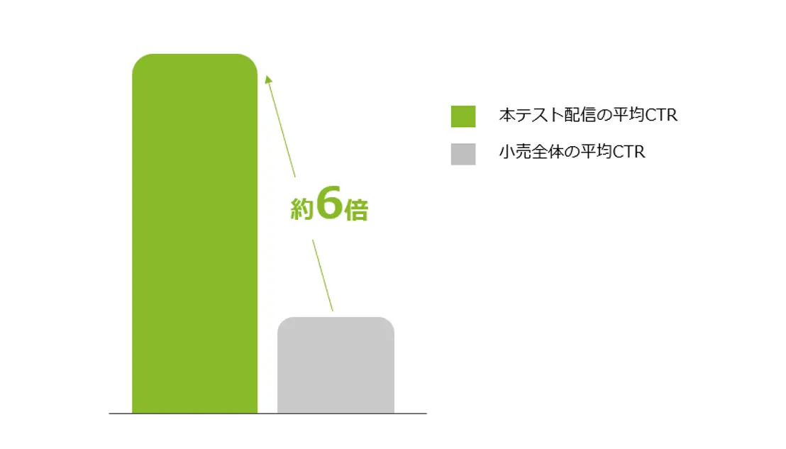 広告配信対象のコンテンツに対して、広告主の商品やキャンペーンのコンセプトと意味的・文脈的な関連性が高い配信先をAIが選定して消費者のモーメントを捉える。効果検証を目的にコンテクスト広告を用いたしたテスト配信を10月2日から6日まで計5日間、小売業が広告主で特定のテーマに関する物販イベントの告知をしたところ、小売業全体の平均CTR(クリック率)を大きく上回る約6倍のクリックにつながった。