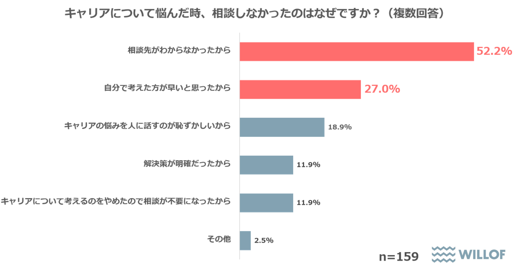 一方で「キャリアについて相談したことがない」と回答した159人に「相談しなかった理由」を聞くと、「相談先がわからなかった」52.2%が特に多く、2位の「自分で考えたほうが早いと思った」27.0%の倍近かった。
