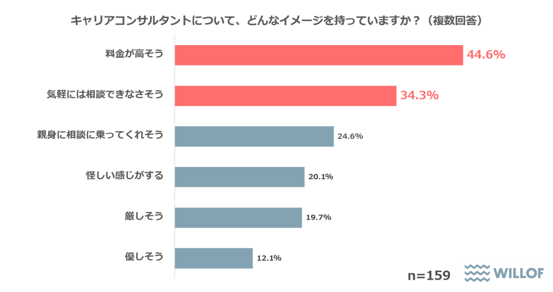 なお相談先の選択肢として「キャリアコンサルタント」について聞くと、「まったく知らない」43.8%、「名称は聞いたことはあるが、詳しくはわからない」37.9%で認知率は低い。「キャリアコンサルタントについてどのようなイメージを持っているか」では、「料金が高そう」44.6%、「気軽には相談できなさそう」34.3%が上位の一方で、「親身に相談に乗ってくれそう」24.6%も一定数存在した。