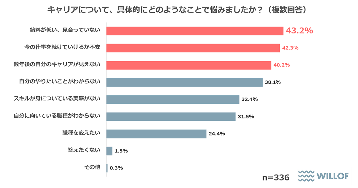 まず「自分のキャリアについて悩んだ経験があるか」を聞くと、「ある」は65%で過半数が経験ありだった。「自分のキャリアについて悩んだ経験がある」と回答した514人に、「具体的にどのような内容で悩んだか」を聞くと、「給料が低い、見合っていない」43.2%が最多。以下「今の仕事を続けていけるか不安」42.3%、「数年後の自分のキャリアが見えない」40.2%が続いた。