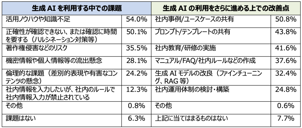 最後に「生成AIを利用するなかで感じている課題」「生成AIの利用をさらに進める上での改善点」を利用者3,347人に聞くと、課題では「活用ノウハウや知識不足」54.0%が最多で、「正確性が確認できない、または確認に時間を要する」50.1%がそれに並ぶ。改善点では「社内事例/ユースケースの共有」50.8%、「プロンプト/テンプレートの共有」43.8%、「社内教育/研修の実施」41.6%が上位だった。