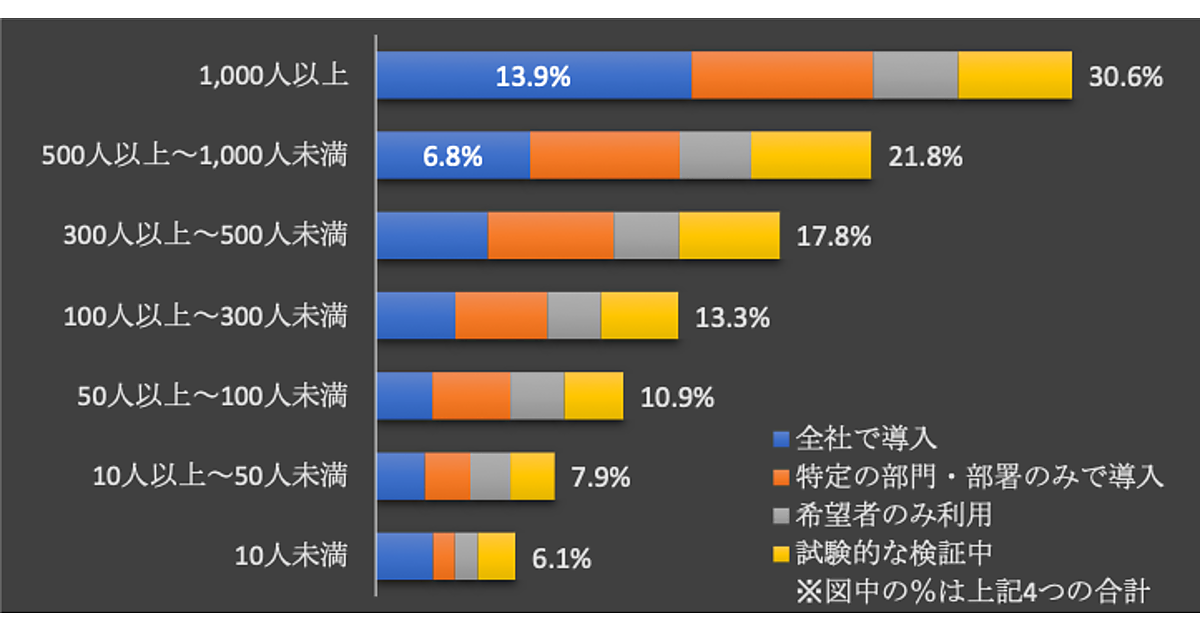 まず「生成AIの導入・利用率」を従業員規模別で見ると、やはり規模が大きいほど企業ほど導入・利用が進んでいる。特に「全社で導入」とした企業は、従業員数1,000人以上の企業では13.9%だが、それ以下では一桁台にとどまり大きく差があった。
