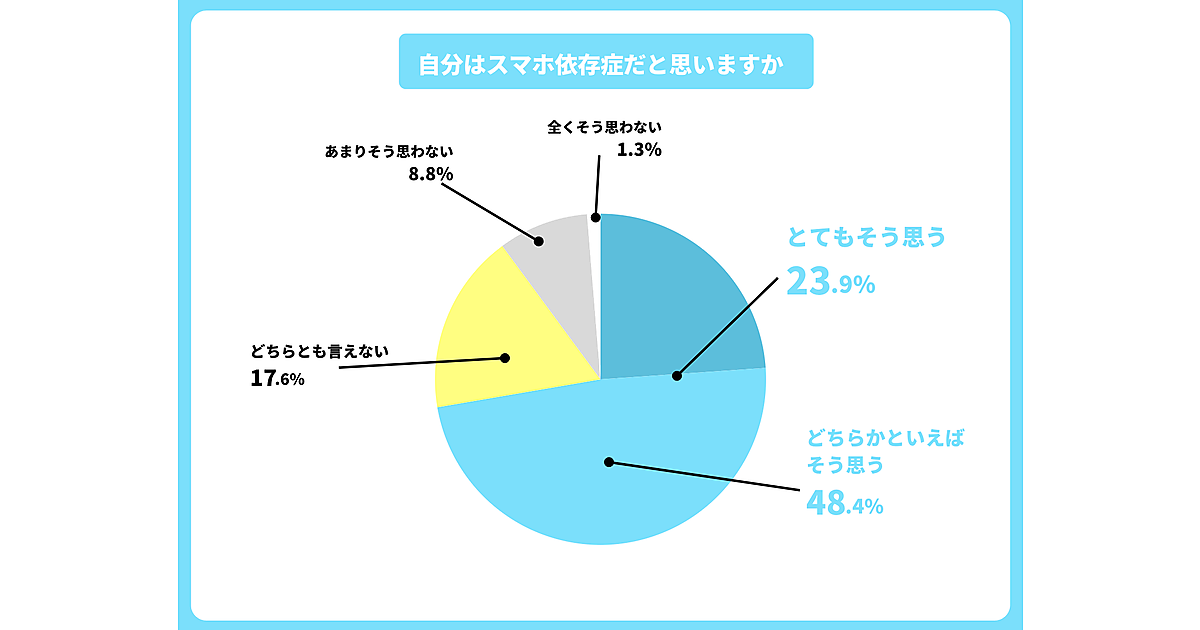 まず「自身がスマートフォン依存症だと思うか」を聞くと、「強くそう思う」23.9%、「ややそう思う」48.4%で、計72.3%が依存傾向を自覚していた。「スマートフォンやインターネットがない生活を想像できるか」と聞くと、「まったく想像できない」42.8%、「あまり想像できない」29.6%で、計72.4%とこちらも7割超が依存性を示している。