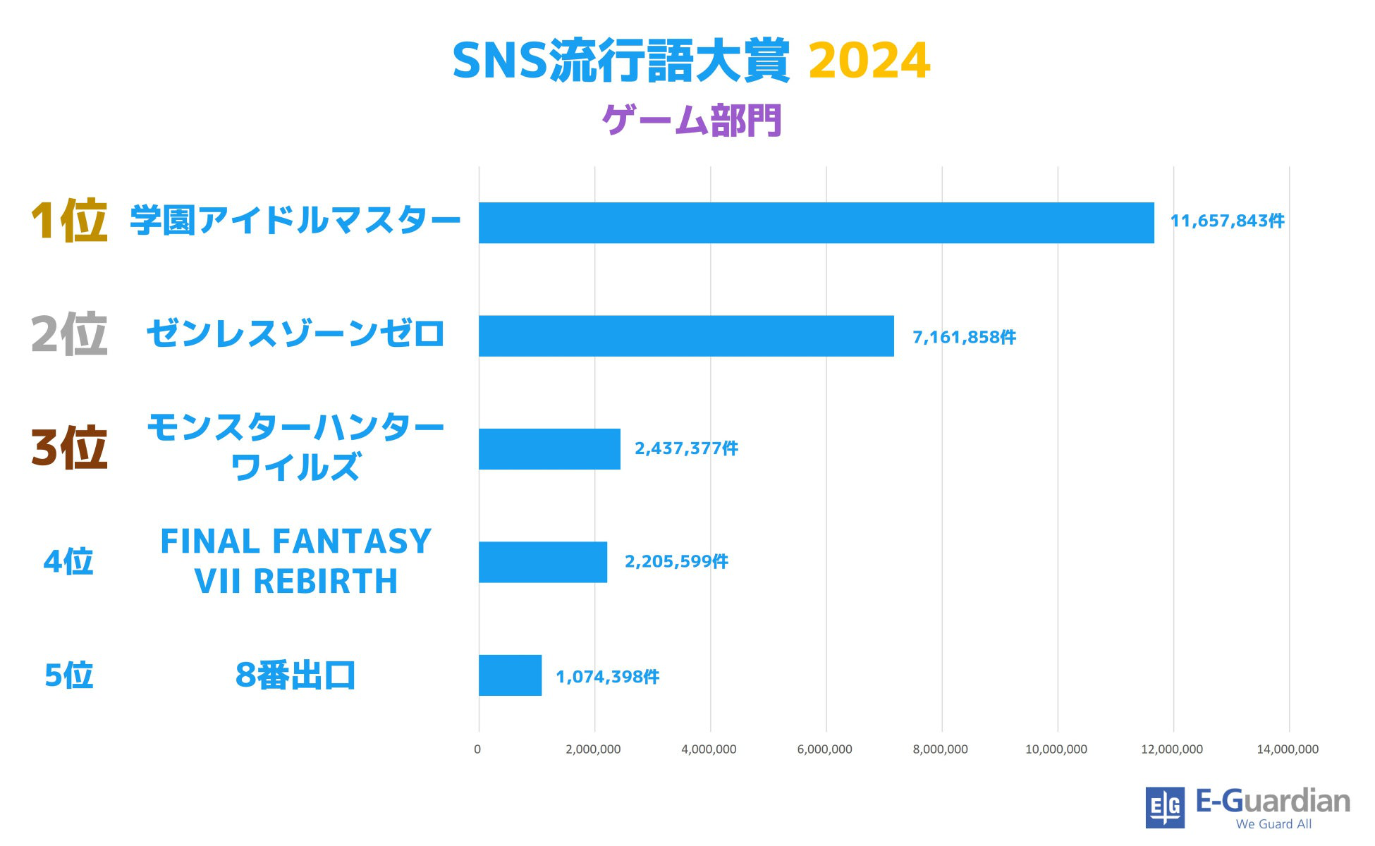 ゲーム部門の1位は「学マス」の愛称で知られる『学園アイドルマスター』。今年5月のリリースで既に100万ダウンロードを突破している。2位は『ゼンレスゾーンゼロ』、3位は『モンスターハンターワイルズ』、4位は『FINAL FANTASY VII REBIRTH』と続き、昔から人気のタイトルも新シリーズの発売により注目を集める結果となった。