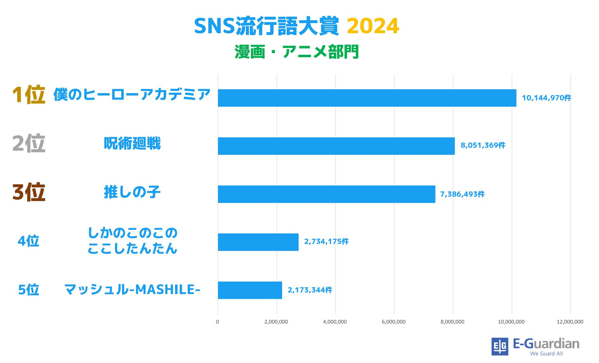 漫画・アニメ部門では、今年8月に劇場版が公開され、本誌ではついに完結を迎えた『僕のヒーローアカデミア』が1位に。2位の『呪術廻戦』や3位の『推しの子』も今年完結しており、大ヒット作品に注目が集まった。また、『しかのこのこのここしたんたん』や『マッシュル-MASHLE-』はオープニング曲がTikTokなどで流行した。