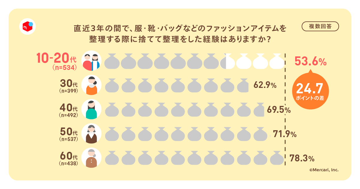 最後に、直近3年間のファッションアイテムの整理の仕方について年代別に聞くと、「捨てた」が最も多いのは60代で78.3%、最も少ないのは10代~20代で53.6%となり、24.7ポイントの大差となった。