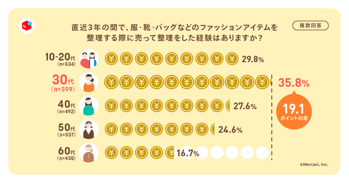 一方で、「売った」と回答した割合は30代が最も多く35.8%に。ついで10代~20代が29.8%、40代が27.6%と続いており、60代と30代を比べるとこちらも19.1ポイントと大きな差がついていた。