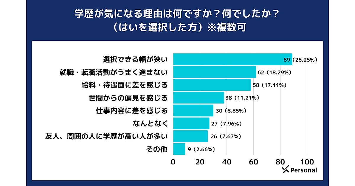 そこで「学歴が気になる理由」を聞くと、「選択できる幅が狭い」26.25%が最多。以下「就職・転職活動がうまく進まない」18.29%、「給料・待遇面に差を感じる」17.11%がそれに続いた。