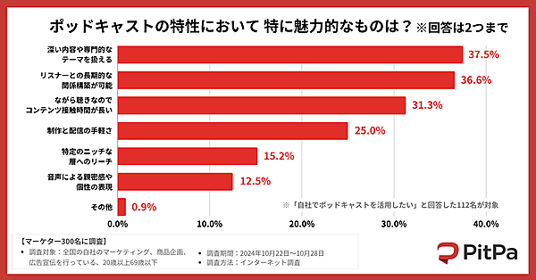 「ポッドキャストの特性として特に魅力的なもの」としては、「深い内容や専門的なテーマを扱える」37.5%、「リスナーとの長期的な関係構築が可能」36.6%、「ながら聴きによるコンテンツ接触時間の長さ」31.3%、「制作と配信の手軽さ」25.0%などが上位だった。