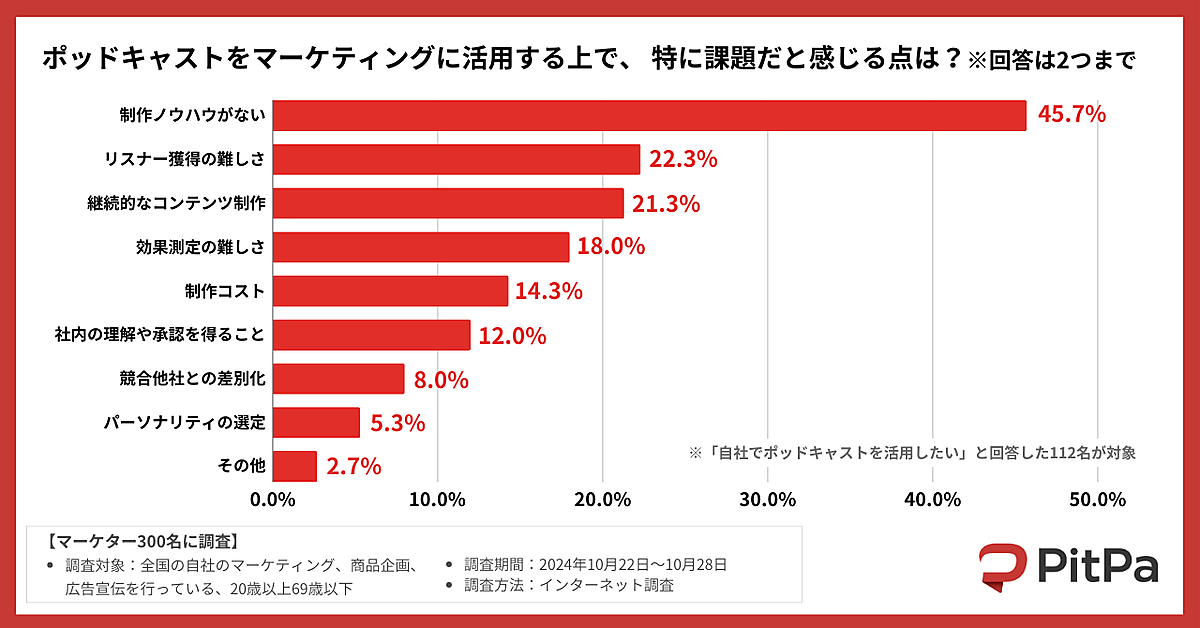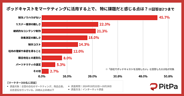 一方「ポッドキャスト活用における課題」については、「制作ノウハウがない」45.7%、「リスナー獲得の難しさ」22.3%、「継続的なコンテンツ制作」21.3%などが上位で、既存のデジタルマーケティングやSNS施策とは異なるポッドキャストの性質が浮き彫りになっている。