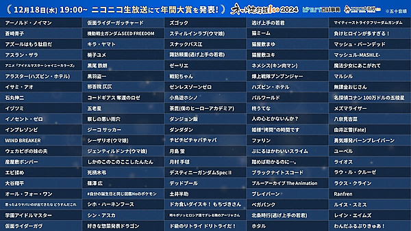 共同企画「ネット流行語100」は、両社が運営する「ニコニコ大百科」「ピクシブ百科事典」の各単語ページにおける2024年のアクセス数を集計し、ネットでもっとも流行った言葉を決定するもの。2018年にスタートし、今年で7回目。表彰式はニコニコ生放送で生中継され、ノミネート単語にゆかりのある人物・団体などが登壇する。