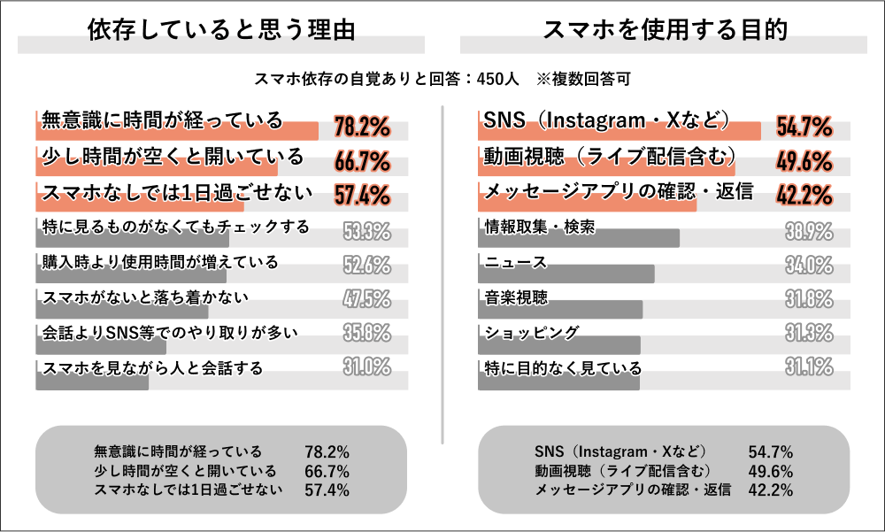 スマホ依存の自覚ありと答えた人に対し、その理由を聞くと、「無意識に時間が経っている」「少し時間が空くと開いてしまう」「スマホなしでは1日過ごせない」といった回答が上位に。具体的にどんな目的で使っているかを聞くと、「SNS」が54.7%で最多となり、「動画視聴」が49.6%と続いた。