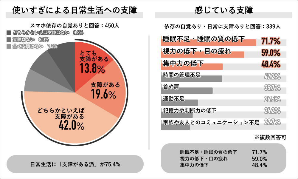 また、スマホの使いすぎによる日常生活への支障有無を聞くと、「支障がある」の合計は75.4%にのぼっており、内訳は「どちらかといえば支障がある」が42.0%を占めた。具体的な内容としては、「睡眠不足・睡眠の質の低下」が71.7%で最も多く、以下「視力の低下・目の疲れ」が59.0%、「集中力の低下」が48.4%と続いた。