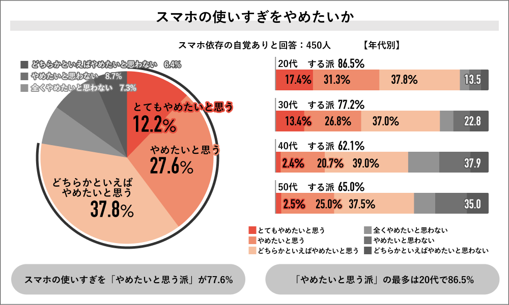 スマホの使いすぎをやめたいと思うかという質問では、77.6%の人が「やめたいと思う」と回答。20代では86.5%の人が「やめたい」と回答しており、スマホ依存の深刻さがうかがえた。