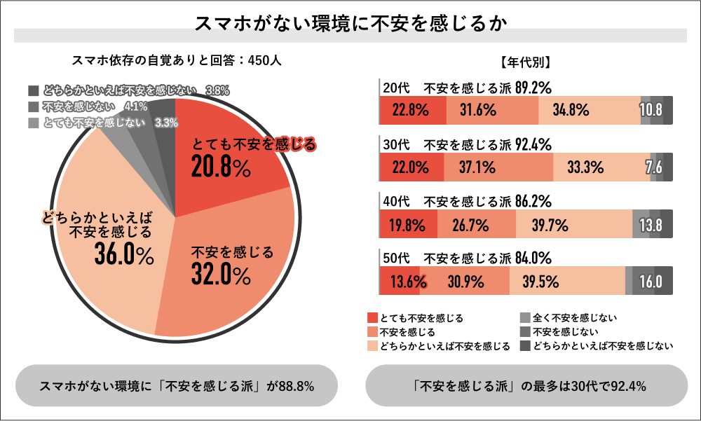 さらに、スマホがない環境に不安を感じるかを聞くと、88.8%の人が「不安を感じる」と回答。年代別に見ると、最も不安を感じる人が多いのは30代で、92.4%にのぼった。