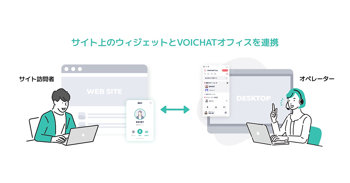 サイト上のウィジェットと同社のコミュニケーションツール「VOICHATオフィス」を連携させる。サイトを訪れた顧客はそのままサイト上でスタッフと会話でき、課題がその場で解決する。見込み客がサイトを訪れるとスタッフに通知され、接客ルームに入室して回答が可能。