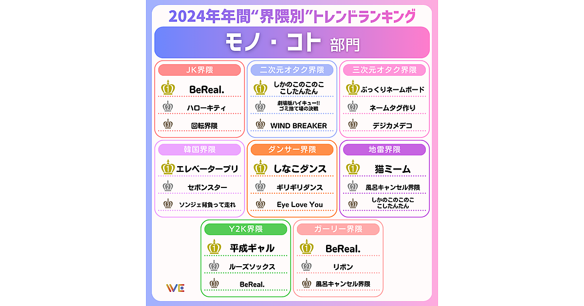 モノ・コト部門では、SNSアプリ「BeReal.」が今回も根強い人気となった。JK界隈では2024年上半期に引き続き1位を獲得し、ガーリー界隈、Y2K界隈でもランクイン。また、Y2K界隈の「平成ギャル」「ルーズソックス」、韓国界隈の「セボンスター」、三次元オタク界隈の「デジカメデコ」など、平成ブームが続いている様子が見て取れた。