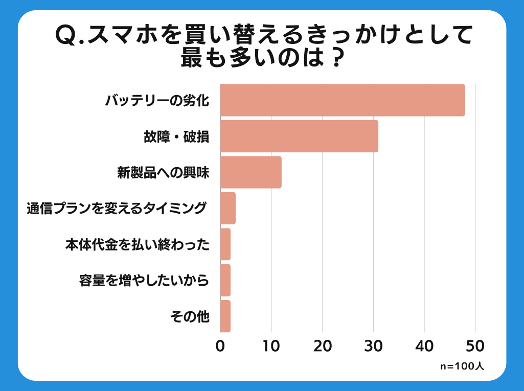「スマホを買い替えるきっかけ」では、「バッテリーの劣化」をあげた人が48人で最多。以下「故障・破損」31人、「新製品への興味」12人と、使用上の支障をあげた人が多い。